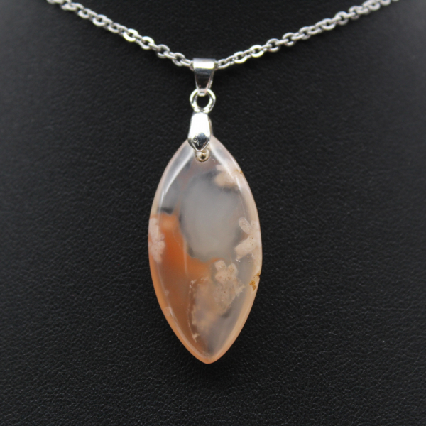 Agaat is een microkristallijne variant van kwarts, een mineraal bestaande uit silica, dat zich meestal vormt in holtes van vulkanisch gesteente, waar oplossingen die rijk zijn aan silica in opeenvolgende lagen worden afgezet. Deze afzettingen, vaak van verschillende kleuren, creëren de karakteristieke patronen van agaat, variërend van parallelle banden tot dendritische vormen. De diversiteit aan kleuren is te danken aan de aanwezigheid van onzuiverheden zoals ijzeroxiden, mangaan of andere sporenelementen.